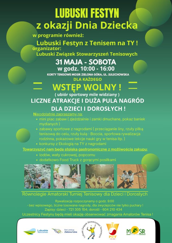 Dnia 31 maja (sobota) na obiekcie sportowym MOSiR-u przy ul. Sulechowskiej (od strony kortów tenisowych) odbędzie się Lubuski Festyn z okazji Dnia Dziecka.Organizatorem imprezy jest Lubuski Związek Stowarzyszeń Tenisowych przy pomocy Miasta, ogólnopolskiego Polskiego Związku Tenisowego i innych wspierających przedsięwzięcie).